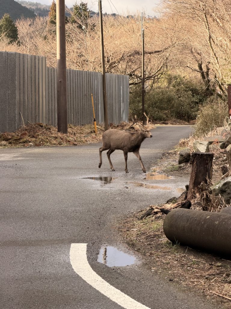 朝方、相棒と散歩をしていたら大きな鹿に出会いました。